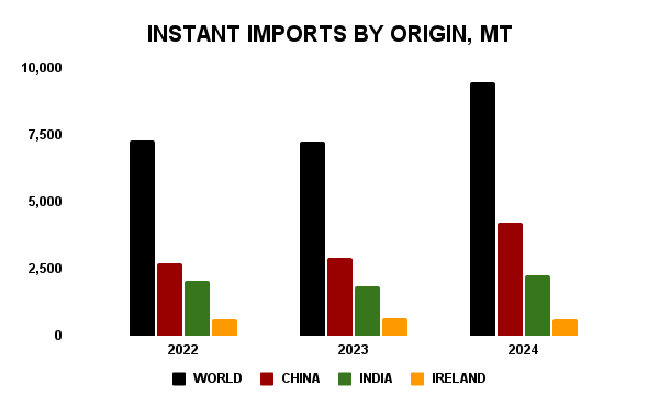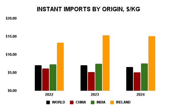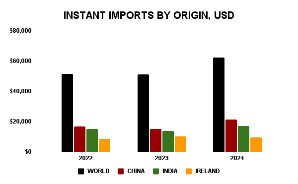 About one-third of 2024 US instant tea imports by value originated from China- $21.5 million. Imports from China, India, and Ireland provide a combined 76.9% of total import value.