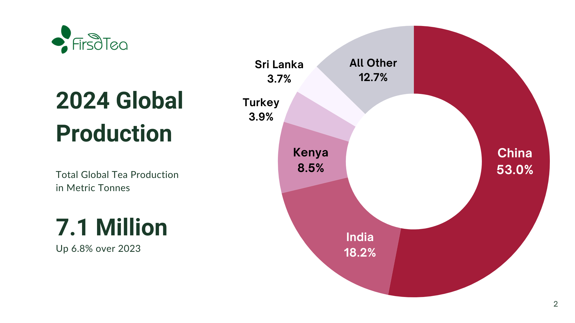 Global tea production rose by 6.8 percent over the previous year, from 6.6 to 7.1 million metric tons (mmt). China accounted for 53 percent, or 3.7 mmt, of global production volume while increasing their own production by 12 percent over the previous year. India took second place with 18.2 percent even with a production drop of 6.1 percent. The industry watched intently, as the Assam region particularly saw a shortened season and reduced yields. Kenya rounds out the top 3 producers with 8.5 percent of the world’s annual production. Taken together, these 3 producers account for 80 percent of global production for 2024. Other major tea-producing countries saw shifts in production levels. Turkey edged out Sri Lanka to become the fourth largest producer by volume. Bangladesh saw a 9.6 percent drop in production, which coincided with civil unrest and the overthrow of the Bangladeshi government. Argentina, a significant source of black teas for the US market, saw a recovery, increasing its production levels by 19.1 percent over the previous year. Overall global tea production levels are expected to continue rising.