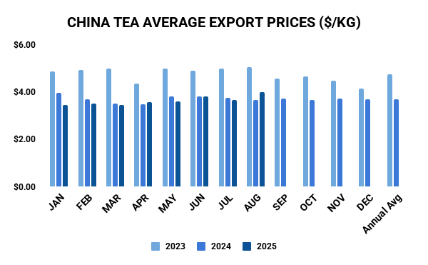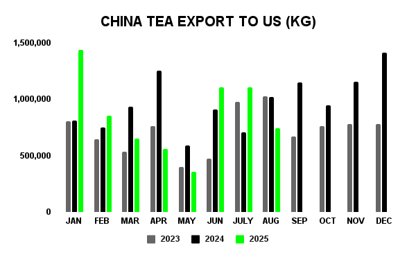 Data from China Customs was recently published regarding China exports for August 2025. GATS data on US imports of tea was not available at time of publication due to the federal government shutdown.