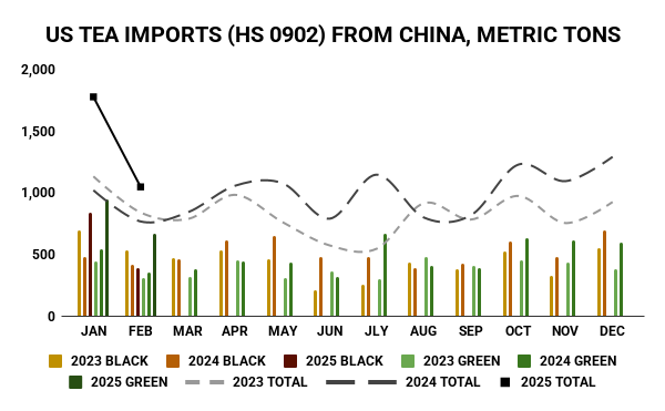 Data from China Customs and the US Census Bureau (GATS) was recently published regarding China exports and US imports of tea for February 2025.