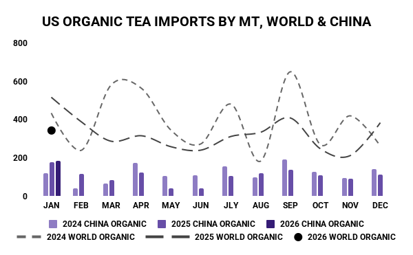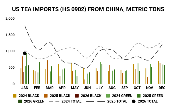 GATS data on US imports of tea was recently published for January 2026. China Customs export data was not available at time of publication due reporting delays created by the Chinese New Year holiday.