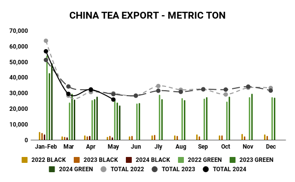 - Exports of GREEN tea volume DECREASED 7.9% over May 2023