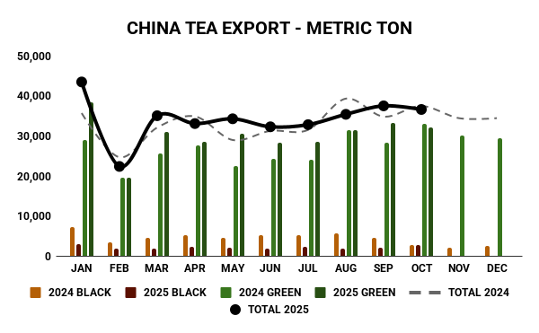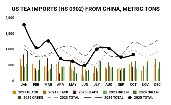 US tea imports from China through October 2025 totaled 9,497 metric tons, essentially flat (-0.3%) compared to 2024. China green tea imports increased 11.5%, representing 32.3% of total US green tea imports. Black tea and organic tea imports from China both declined approximately 11% year-to-date.