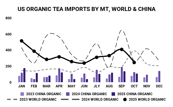From the US import perspective, China maintains critical market positions in green tea (32.3% share) and organic (31.7% share), though volumes show pressures in both categories. The sharp October decline in US imports from China (-32.3%) warrants close attention, as tariff rates were reduced in early November.