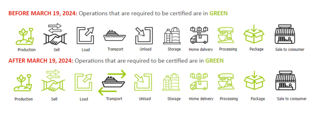 A: “There is no rule defined in the SOE about the reception date.The only date is about the NOPIC requesting date. Per 205.273(a) of the SOE regulations: ‘Persons exporting organic agricultural products to the United States must request an NOP Import Certificate from a certifying agent prior to their export.’ It is also mentioned that each import must ‘be associated with valid NOP Import Certificate data’ while being declared as organic to US Customs and Border Protection (on the ACE portal).”