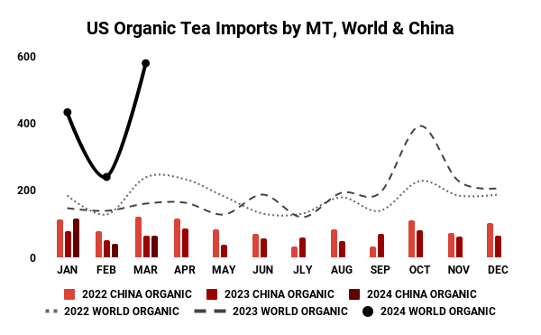 Following up on these developments since the regulations went into effect has shown a marked uptick in organic imports in the first quarter of 2024. There are a couple of possible explanations for the significant rise in reported organic tea imports. Imports in Jan- to early March may have been organic imports being brought in before the new rules came into effect in order to avoid the need to for extra administrative and documentation efforts related to securing a NOPIC. Another explanation may be that exporters/importers have shifted their practices to more accurately report organic product under the appropriate imports codes. Previously imported organic teas may have been declared as conventional teas because is wasn’t necessary to specify them as organic imports in order to sell them as organic after arrival. As a result of these changes, however, total monthly organic tea imports are now ranging between 74-260% HIGHER than the corresponding 2023 month. This also means that organic teas as a share of total teas imported each month is rising from around 2.5% up to about 5%.